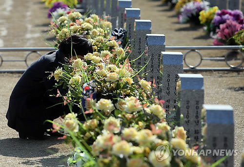 △ 끝나지 않은 슬픔 (대전=연합뉴스) 양영석 기자 = 천안함 피격 5주기를 하루 앞둔 25일 대전 현충원 천안함 묘역을 찾은 유가족들이 희생자들을 추모하고 있다.
