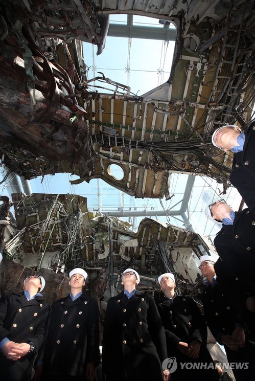 △ 천안함 바라보는 해군 장병들 (평택=연합뉴스) 신영근 기자 = 천안함 사건 5주년을 일주일 앞둔 19일 오전 해군 장병들이 경기도 평택 해군 제2함대 사령부에 전시된 피격 천안함을 살펴보며 조국 수호 의지를 다지고 있다. 2015.3.19 drops@yna.co.kr http://blog.yonhapnews.co.kr/geenang