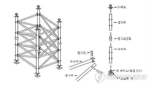 | △ 국토부 동바리 설치지침에 나온 조립형 동바리 (용인=연합뉴스) 수직·수평·경사재를 각각 연결재로 조립한 형태의 '조립형 동바리'는 비교적 안전도는 떨어지나 설치비용이나 시간이 적게 들어 공사 현장에서 많이 쓰이고 있다. 2007년 12월 당시 건설교통부(국토교통부)가 발행한 일종의 행정지침인 '콘크리트 교량 가설용 동바리 설치지침'에는 '조립형 동바리의 설치 높이는 시공성과 안전성을 고려해 10m이내여야 한다'고 돼 있다.2015.3.27 <<국토부 지침서 발췌>> goals@yna.co.kr |