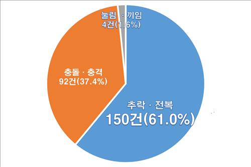 유형별로 카트에 탑승한 아이가 추락하거나 카트가 넘어져 발생한 사고가 150건(61%), 아이가 카트에 부딪힌 충돌·충격 사고가 92건(37.4%) 등이었다.