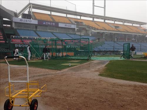 이날 경기장 일대는 아침부터 꾸준히 빗줄기가 내렸지만, 정오 무렵부터 그라운드 한가운데에는 배팅케이지가 들어섰다.