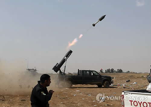 | △ IS 진지 향하는 이라크군의 로켓탄 (AP=연합뉴스) 수니파 극단주의 무장세력 '이슬람국가'(IS) 토벌에 나선 이라크군이 30일(현지시간) 티크리트에서 IS 진지를 향해 로켓탄를 쏘고 있다. marshal@yna.co.kr Iraqi security forces launch a rocket against Islamic State extremist positions during clashes in Tikrit, 130 kilometers (80 miles) north of Baghdad, Iraq, Monday, March 30, 2015. (AP Photo/Khalid Mohammed) |