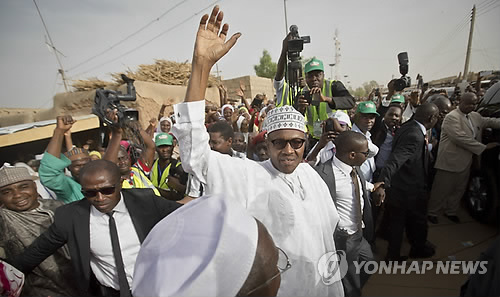 | △ (AP=연합뉴스) 31일(현지시간) 나이지리아 대선·총선에서 전 군부 통치자 무함마두 부하리 후보가 이끄는 제1야당 범진보의회당(APC)이 승리했다고 나이지리아 선거관리위원회가 발표했다. 사진은 지난 28일 나이지리아 다우라에서 부하리 후보가 투표를 마친 뒤 지지자들을 향해 손을 흔드는 모습. (AP Photo/Ben Curtis, File) |