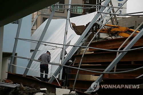 △ 제주에 분 강풍에 무너진 공사장 펜스 (제주=연합뉴스) 고성식 기자 = 2일 오후 제주시 노형동 한 호텔 공사장의 안전펜스가 강풍으로 쓰려져 근로자가 수리를 하고 있다. 안전펜스는 바로 옆 아파트 담장을 덮쳐 담장 20m가량과 주차장에 세워진 일부 차량이 파손됐다.