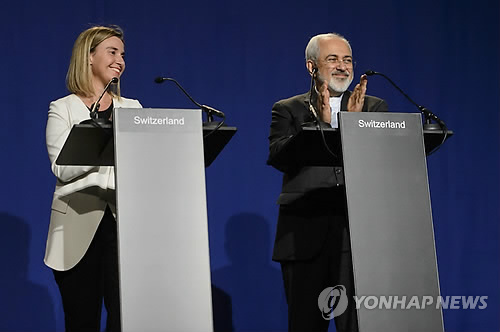 | △ 이란 핵 협상 타결을 발표하는 페데리카 모게리니 유럽연합(EU) 외교안보 고위대표와 무함마드 자바드 자리프 이란 외무장관. (EPA=연합뉴스) |