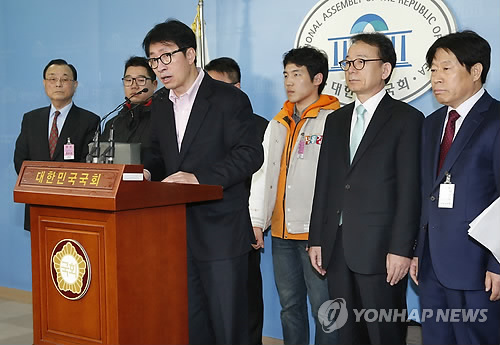 | △ 국립대학 총장 임용 정상화 촉구 기자회견 (서울=연합뉴스) 이상학 기자 = 국립대학총장임용정상화 공동대책위원회 관계자들이 3일 오전 국회 정론관에서 서울, 충청, 경북 지역 국립대학 총장 임용 정상화 촉구 기자회견을 하고 있다. 2015.4.3 leesh@yna.co.kr |