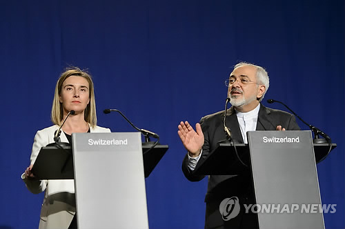 | △ "이란 핵협상 타결됐습니다" (AP=연합뉴스) 무함마드 자바드 자리프 이란 외무장관(오른쪽)과 페데리카 모게리니 유럽연합(EU) 외교안보 고위대표가 2일(현지시간) 스위스 로잔에서 공동성명을 통해 이란 핵협상 타결소식을 발표하고 있다. marshal@yna.co.kr |