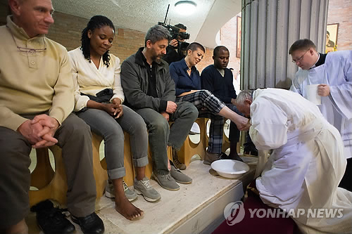 △ 여죄수 발에 입맞춤하는 프란치스코 교황 (AP/로세르바토레 로마노=연합뉴스) 프란치스코 교황이 2일(현지시간) 이탈리아 로마 외곽 레비비아 교도소를 방문, 한 여자 죄수의 발에 입맞춤하고 있다. 교황은 부활절을 앞두고 이날 교도소를 방문해 재소자 12명과 한 아기의 발을 물로 씻어주었다. 교황은 세족례 후 교황인 자기도 더러움에서 청결해질 수 있도록 기도해 달라고 재소자들에게 부탁했다.