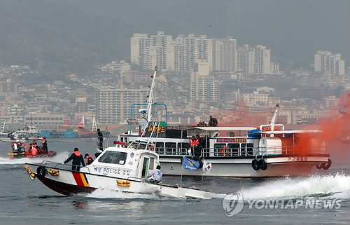 △ 지난 3월 경남 창원시 마산합포구 마산만내 돝섬 해상에서 남해해양경비안전본부 주관으로 유람선이 돝섬 인근 해상에서 암초와 충돌해 침몰하는 상황을 가정해 '2015 해양안전 종합훈련'이 실시됐다.(연합뉴스 자료사진)