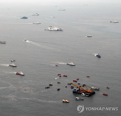 | △ <세월호 참사 1년> 하늘에서 바라본 사고해역의 모습 (서울=연합뉴스) 세월호 참사가 발생한 지 16일로 1년이 된다. 상당수 국민은 충격과 슬픔에서 벗어나 일상으로 돌아갔지만 유족과 실종자 가족의 상처는 여전하다. 연합뉴스는 세월호 참사 1년을 뒤돌아 보고 그동안의 진상규명과 과정과 한국 사회의 안전 변화상, 개선방향을 점검한다. 사진은 2014년 4월 22일 헬리캠으로 촬영한 사고 해역의 구조작업의 모습. 2015.4.6 << 연합뉴스DB >> photo@yna.co.kr |