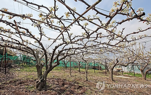 △ 울산지역 배 과수원 면적·수확량 감소 (울산=연합뉴스) 김용태 기자 = 울산지역 배 과수원 면적이 지난해 기준 996㏊로 10년 전인 2005년에 비해 33% 감소한 것으로 나타났다. 배 수확량도 2만3천526t으로 2005년보다 24.5% 줄었다. 사진은 9일 오전 울산시 북구의 한 배 과수원의 모습. 2015.4.9 yongtae@yna.co.kr