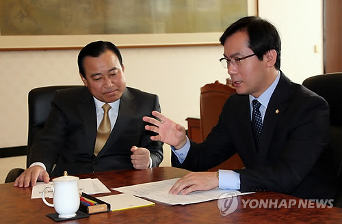 △ 이완구-김영우 면담 (서울=연합뉴스) 9일 오전 국회에서 새누리당 김영우(오른쪽) 수석대변인이 이완구 국무총리를 만나 포천 사격장 관련 문제를 논의하고 있다. 김 의원 측은 정부 차원의 주민피해 조사 실시와 안전대책·피해보상안 마련을 촉구했다고 밝혔다. 2015.4.9 <<김영우의원실>> suki@yna.co.kr
