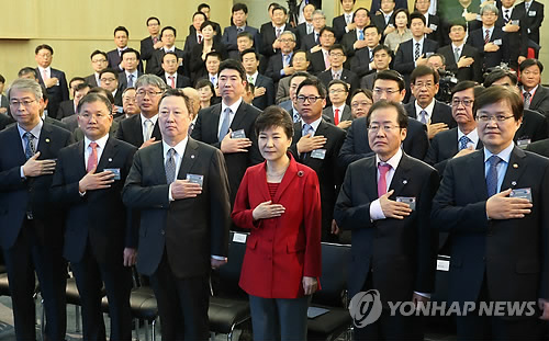 △ 경남창조경제혁신센터 출범식 (창원=연합뉴스) 도광환 기자 = 박근혜 대통령이 9일 오전 경남창원과학기술진흥원에서 열린 경남창조경제혁신센터 출범식에 참석, 박용만 두산그룹회장, 홍준표 경남도지사 등과 함께 국가에 대한 경례를 하고 있다. 2015.4.9 dohh@yna.co.kr