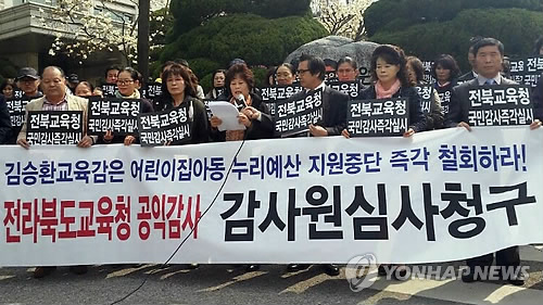 △ 전북어린이집연합회, 감사원서 누리예산 지원 촉구 (전주=연합뉴스) 전북어린이집연합회 대표들은 9일 오전 감사원 앞에서 도교육청의 어린이집 누리과정 예산지원을 촉구하는 집회를 하고 했다. 2015.4.9 <<전북어린이집연합회 제공>> kan@yna.co.kr