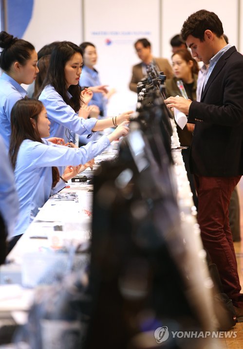 △ '세계물포럼을 위해 왔습니다' (대구=연합뉴스) 한종찬 기자 = 2015 대구·경북 세계물포럼 개막을 하루 앞둔 11일 오전 대구 패션센터에서 외국인 참가자들이 사전 등록을 하고 있다. 오는 12일부터 6일 동안 대구·경북에서 열리는 세계물포럼엔 세계 170여개국 정부·기업·학계 관계자 등이 참여한다. 2015.4.11 saba@yna.co.kr