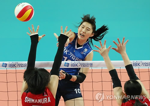 | △ 박정아 강스파이크 (서울=연합뉴스) 서명곤 기자 = 12일 오후 서울 중구 장충동 장충체육관에서 열린 '2015 IBK기업은행 한·일 V리그 톱매치' 여자부 IBK 기업은행과 NEC 레드 로키츠의 경기에서 IBK 기업은행 박정아가 스파이크를 하고 있다. 2015.4.12 seephoto@yna.co.kr |
