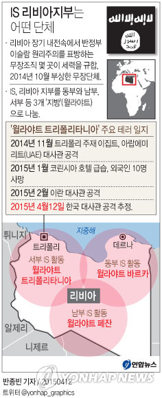 | △ <그래픽> IS 리비아지부는 어떤 단체 (서울=연합뉴스) 반종빈 기자 = 12일(현지시간) 리비아 트리폴리 주재 한국대사관 공격을 자행했다고 주장한 IS 리비아 지부는 지난해 10월부터 부상한 무장단체다. bjbin@yna.co.kr |