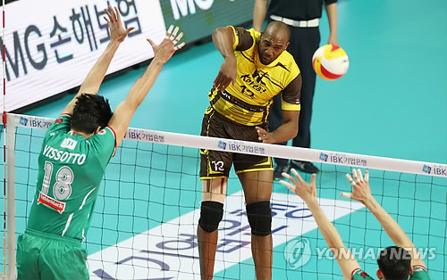 | △ 기습 공격 (서울=연합뉴스) 서명곤 기자 = 12일 오후 서울 중구 장충동 장충체육관에서 열린 '2015 IBK기업은행 한·일 V리그 톱매치' 남자부 OK저축은행과 일본 JT 선더스의 경기에서 OK저축은행 시몬이 강스파이크를 하고 있다. 2015.4.12 seephoto@yna.co.kr |
