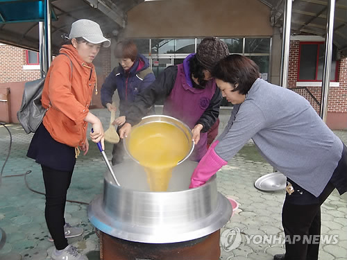 | △ 직접 지어 먹인다 (거창=연합뉴스) 지성호 기자 = 13일 경남 거창군 웅양초등학교 학부모들이 학교 안에 솥 등 조리시설을 갖춰 놓고 자녀들에게 먹일 점심을 직접 만들고 있다. 2015.4.13 shchi@yna.co.kr |