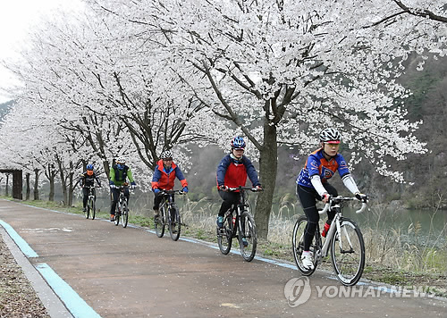 △ 벚꽃 감상하며 달리는 괴산 오천 자전거길 (괴산=연합뉴스) 변우열 기자 = 충북 괴산군의 오천 자전거길에서 자전거 동호인들이 활짝 핀 벚꽃을 감상하면서 자전거를 타고 있다. 이 자전거길은 괴산군에서 세종시까지 하천을 따라 조성된 것으로 2013년 10월에 개통했다. 2015.4.14 << 괴산군 제공 >> bwy@yna.co.kr