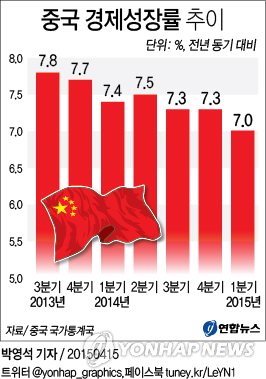 중국 국가통계국은 15일 기자회견을 열어 2015년 1분기 중국의 국내총생산(GDP)이 14조 667억 위안으로 작년 동기보다 7.0% 증가했다고 발표했다.