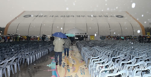 이날 오후 2시께는 분향소 앞 마당에서 세월호 1주년 합동추모식이 예정돼있어 현재 5천석 규모의 야외 무대가 마련돼 있다.