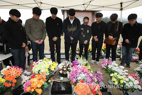 △ 고 남윤철 교사 찾아온 단원고 제자들 (청주=연합뉴스) 황정현 기자 = 세월호 참사 1주년인 16일 오후 청주시 상당구 가덕면 천주교 공원묘지. 세월호가 침몰하던 마지막 순간까지 배에 남아 학생들을 구조하다 유명을 달리한 고(故) 남윤철 교사가 잠든 이곳에 그가 첫 담임을 맡았던 제자들이 찾아와 추모하고 있다.