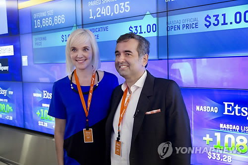 | △ Kristina Salen, left, Etsy’s Chief Financial Officer, poses for photos with Chad Dickerson, Chairman and CEO, following the company's IPO at the Nasdaq MarketSite, Thursday, April 16, 2015, in New York. (AP Photo/Mark Lennihan) |