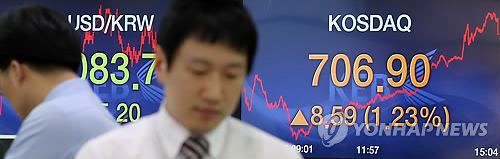 | △ 코스닥, 700선 돌파 (서울=연합뉴스) 이지은 기자 = 코스닥 지수가 7년 3개월 만에 700선을 돌파한 17일 오후 서울 중구 외환은행 본점 딜링룸에서 직원들이 업무를 보고 있다. |
