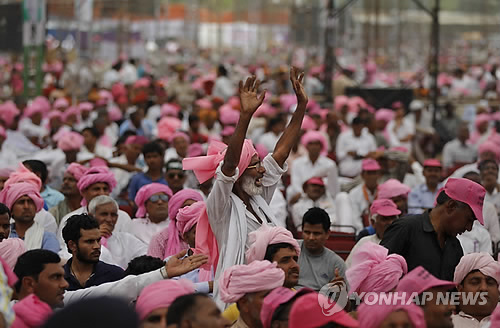 | △ 19일 인도 뉴델리에서 열린 토지수용법 반대 집회(AP=연합뉴스) |