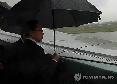 이 전 대통령은 전날 부터 쏟아진 비로 기상 여건이 나빠진 탓에 강정고령보 위를 직접 지나는 대신 인근에 위치한 보 홍보관 디아크에서 보 일대를 둘러봤다.