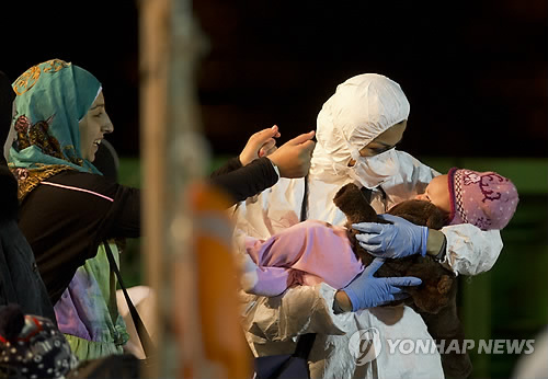 | △ 난민 모자와 구조원 (시칠리아 AP=연합뉴스) 한 구조요원이 20일(현지시간) 이탈리아 시칠리아의 항구에서 난민 어린이를 안고 있다. 아동 28명을 포함해 약 100명의 난민이 19일 부근 지중해에서 화물선에 구조됐다. 수백명이 탄 다른 난민선은 18일 리비아 근해에서 전복되는 참사가 발생했다. (AP Photo/Alessandra Tarantino) |