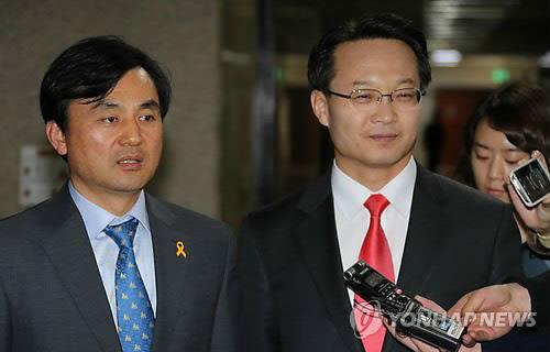 △ 여야 원내수석 회동 (서울=연합뉴스) 백승렬 기자 = 새누리당 조해진(오른쪽)·새정치민주연합 안규백 원내수석부대표가 20일 국회 새정치민주연합 원내수석부대표실 앞에서 만나 취재진의 질문에 답변하고 있다.