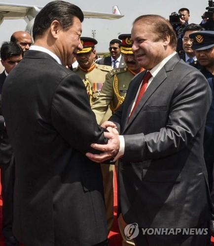 △ 20일 파키스탄을 방문한 시진핑(왼쪽) 중국 국가주석을 나와즈 샤리프 파키스탄 총리가 공항에서 영접하고 있다.(EPA=연합뉴스)