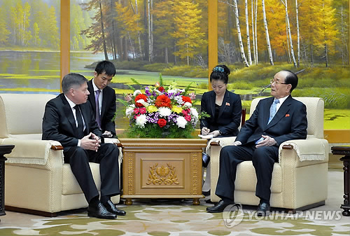△ 러시아 대법원 대표단 만난 김영남 (평양 조선중앙통신=연합뉴스) 김영남 북한 최고인민회의 상임위원장이 17일 만수대의사당에서 러시아 뱌체슬라프 레베데프 최고재판소 소장을 단장으로 한 러시아 대법원 대표단을 만났다고 조선중앙통신이 보도했다. 2015.4.17 photo@yna.co.kr