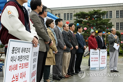 △ 총장 반대 릴레이 단식 선포식 (서울=연합뉴스) 박영서 기자 = 동국대 교수협의회가 20일 오전 서울 동국대학교에서 '총장 반대 릴레이 단식 선포식'을 열고 있다. 동국대는 총장 선출을 놓고 종단개입과 후보자의 논문 표절 논란이 불거지며 내홍을 겪고 있다. 2015.4.20 conanys@yna.co.kr