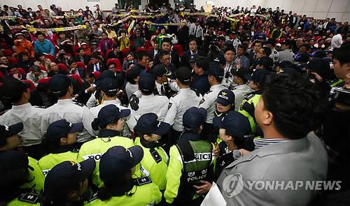 | △ 무산된 의왕시 법무타운 조성 시민공청회 (의왕=연합뉴스) 21일 오후 경기도 의왕시 오전동 의왕시여성회관에서 열릴 예정이었던 '의왕 왕곡동 일원 법무타운 조성 및 도시개발 관련 시민 공청회'가 안양교도소의 의왕 이전을 반대하는 주민들의 반발로 무산됐다. 2015.4.21 << 경기신문 제공 >> drops@yna.co.kr |