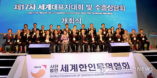 △ 한인 경제인 모여 구미 중소기업과 동반 성장 모색 (구미=연합뉴스) 강성철 기자 = 전 세계 68개국 135개 도시에 지회를 둔 최대 규모의 재외동포 경제단체 세계한인무역협회(월드옥타)는 경북 구미시의 구미코(구미컨벤션센터)에서 '세계대표자대회 및 수출상담회' 개막식을 개최하고있다. wakaru@yna.co.kr