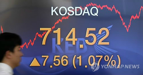 | △ 코스닥지수가 710선을 돌파한 21일 오후 서울 중구 외환은행 본점 딜링룸에서 한 직원이 전광판 앞을 지나고 있다. |