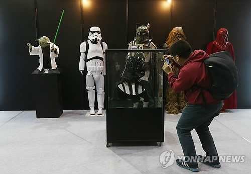 △ 2015 키덜트 엑스포 (서울=연합뉴스) 이지은 기자 = 26일 오후 서울 양재동 aT센터에서 열린 '2015 키덜트 엑스포'를 찾은 한 관람객이 영화 스타워즈에 등장한 다스베이더 모형을 사진찍고 있다. 2015.3.26 jieunlee@yna.co.kr