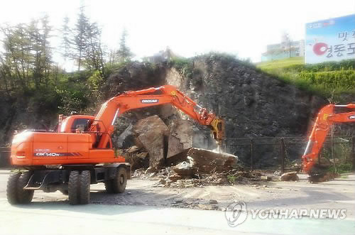 | △ 무너진 바위 치우는 중장비 (영동=연합뉴스) 박병기 기자 = 21일 오후 3시 40분께 충북 영동군 영동읍 동정리의 절개지서 50여t의 바위와 돌이 도로 위로 무너져 내렸다. 영동군이 중장비를 투입해 낙석을 치우고 있다. 2015.4.21 bgipark@yna.co.kr |
