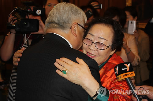 △ 포옹하는 마이크 혼다 의원과 이용수 위안부 할머니 (워싱턴=연합뉴스) 노효동 특파원 = 지난 2007년 미국 하원의 일본군 위안부 결의안 통과의 주역인 마이크 혼다(민주·캘리포니아) 의원과 같은 해 미국 하원 청문회에 나와 증언했던 일본군 위안부 피해자 이용수(87) 할머니가 21일(현지시각) 미국 하원에서 만나 포옹하고 있다. 2015.4.22 rhd@yna.co.kr