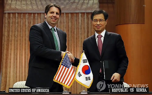 △ 한미원자력협정 타결 (서울=연합뉴스) 전수영 기자 = 한미원자력협정이 4년 6개월여간의 협상 끝에 타결, 22일 오후 서울 세종로 외교부 청사에서 박노벽 외교부 원자력 협력대사와 마크 리퍼트 주한 미국대사가 협정에 가서명한 뒤 악수하고 있다. swimer@yna.co.kr