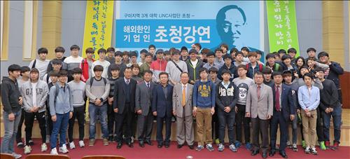 △ 이영현 캐나다 영리무역 회장은 22일 경북 구미시 IT의료융합기술센터 강당에서 금오공대, 구미대, 경운대 학생 250여 명에게 자신의 성공 노하우를 전수했다.
