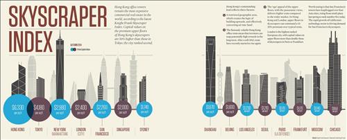 '초고층건물 지수(Skyscraper Index)' 보고서는 세계적으로 상징성 있는 주요 관문(Gateway) 도시 소재 고층 업무시설의 상층부 임대료를 비교하는 지표이다. '고층 업무시설'은 150m 이상 높이 건물의 상부층 30%를 나타낸다. 서울에서는 여의도의 63빌딩과 IFC, 삼성동 무역센터와 아셈타워 정도가 해당된다.