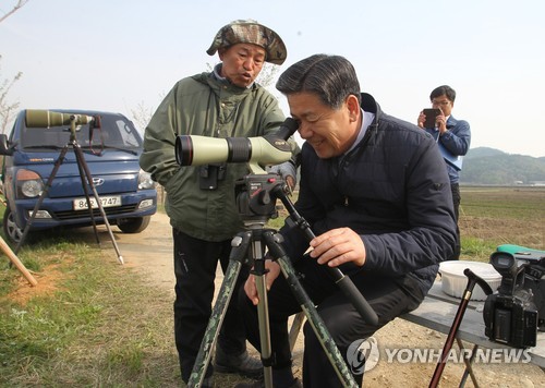 | △ 황새 관찰하는 진천군수 (진천=연합뉴스) 변우열 기자 = 유영훈 충북 진천군수가 24일 진천군 진천읍 백곡천에서 '새 박사' 윤무부 경희대 명예교수와 함께 황새를 관찰하고 있다. 이곳에는 지난해 4월 한국교원대 황새공원을 탈출한 황새 '미호'와 시베리아에서 월동을 위해 국내에서 날아들었다가 철새 무리에서 떨어져 나온 황새 1마리가 서식하고 있다. 2015.4.24 << 진천군 제공 >> bwy@yna.co.kr |