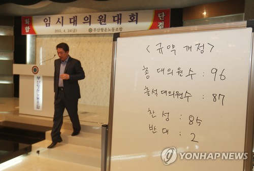| △ 지부장 직선제 폐지한 부산항운노조 (부산=연합뉴스) 김선호 기자 = 부산항운노조가 24일 부산시 동구 초량동 항운노조 빌딩에서 임시 대의원대회를 열어 10년 만에 지부장 선임 방식을 직선제에서 간선제로 전환하기로 결정했다. 투표결과가 적힌 게시판 뒤로 김상식 위원장이 단상에서 내려오고 있다. 2015.4.24 wink@yna.co.kr |