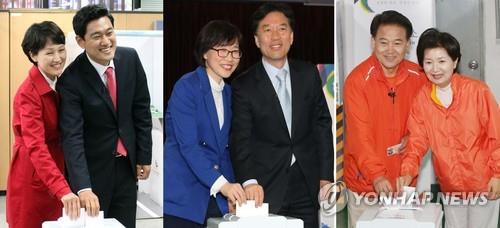 | △ 4·29재보궐선거 사전투표하는 관악을 국회의원 후보들 (서울=연합뉴스) 백승렬 박동주 기자 = 4·29재보궐선거 사전투표가 실시된 24일 서울 관악을 국회의원에 출마한 새누리당 오신환 후보 내외가 미성동 주민자치회관에서(왼쪽 부터), 새정치민주연합 정태호 후보내외가 난곡동 주민센터에서, 국민모임 정동영 후보 내외가 대학동주민센터에서 각각 사전투표하고 있다. |