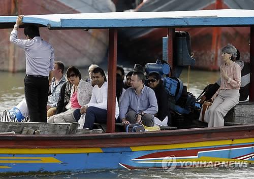 | △ (AP=연합뉴스 자료사진) 인도네시아 중부 자바주(州) 칠라차프의 누사캄방안 섬 교도소에 수감된 호주인 사형수 앤드루 챈과 뮤란 수쿠마란의 가족들 및 발리 주재 호주 총영사 마젤 힌드(오른쪽)가 지난달 면회를 위해 누사캄방안 섬으로 향하는 배에 오르고 있다. 누사캄방안 교도소에는 현재 외국인 9명을 포함해 마약사범 사형수 11명이 수감돼 있다. |