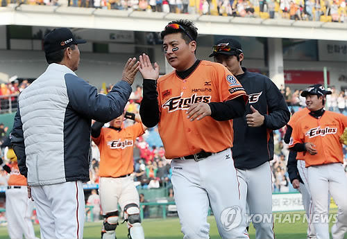 | △ 한화 3연승 (대전=연합뉴스) 양영석 기자 = 26일 대전 한밭야구장에서 열린 프로야구 한화와 SK의 경기. 3연승을 기록한 한화 선수들이 김성근 감독과 하이파이브하고 있다. 2015.4.26 youngs@yna.co.kr |